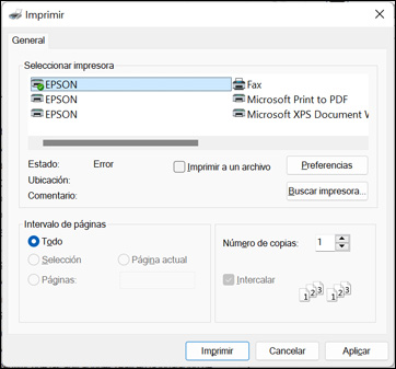 Verá la ventana Imprimir de su aplicación, tal como esta: