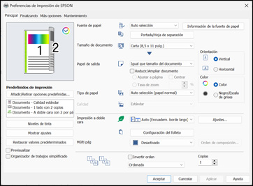 imprimir. Los siguientes ajustes no están disponibles cuando