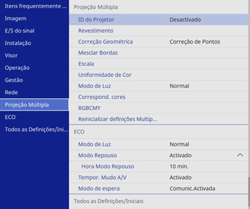 | Reinicializar definições Multiprojeção | — | Retorna todas as configurações do menu Projeção Múltipla para os seus valores iniciais. |