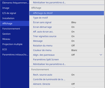 Les options du menu Affichage vous permettent de personnaliser les diverses fonctions d'affichage du projecteur. Les paramètres disponibles varient selon la source d'image actuellement sélectionnée et les autres paramètres.