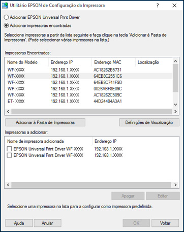 lista de impressoras encontradas e clique em Adicionar à Pasta de Impressoras.