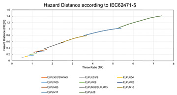 Lorsque vous utilisez des projecteurs et des objectifs interchangeables qui sont du groupe de risque 3, aucune exposition directe au faisceau lumineux n'est permise. Les opérateurs doivent contrôler l'accès au faisceau lumineux à l'intérieur des distances critiques ou installer le produit à une hauteur qui permettra d'éviter l'exposition des yeux au faisceau lumineux à l'intérieur des distances critiques. Regarder dans l’objectif à des distances critiques plus proches que celles indiquées ici peut causer des dommages à la vue.