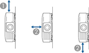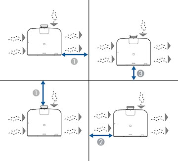 S'il n'y a pas assez d'espace autour du projecteur et que la température interne du projecteur augmente, la luminosité de la source lumineuse peut diminuer. Veillez à ce que l'air chaud provenant de la sortie d'air n'entre pas dans l'évent d'entrée d'air. Les diagrammes suivants indiquent l'espace nécessaire minimum pour un côté spécifique tant que les autres côtés sont libres de toute obstruction.