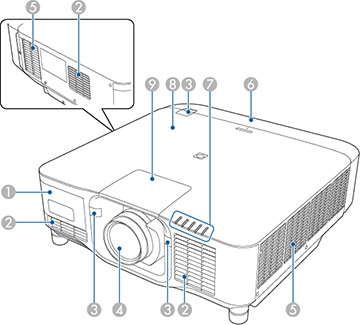 | 2 | Air intake vent | Takes in air to cool the projector internally. |
