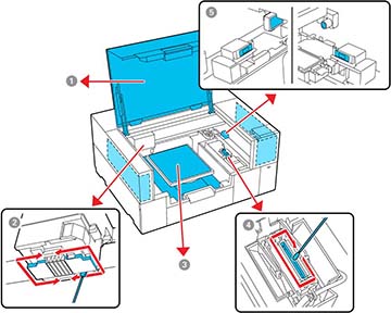 4 | Tapa de succión | Cuando vea un mensaje en la pantalla LCD indicándole que limpie la tapa de succión1, o cuando hay manchas de tinta en la superficie de impresión de la camiseta |