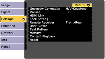 as the lens shift, focus, zoom, and distortion adjustment settings;