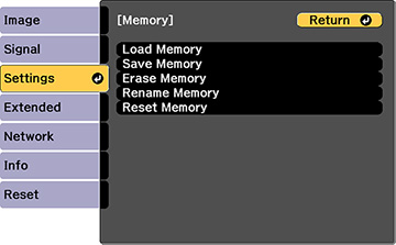 Memory: Overwrites your current settings with saved