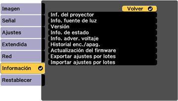 Puede mostrar información acerca del proyector y de las fuentes de entrada mediante el menú Información. Sin embargo, no puede cambiar ningún ajuste del menú.
