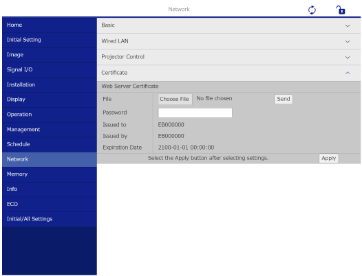 You can also register the digital certificates in the projector's Network menu. However, be sure to register just once or the certificate may not install correctly.