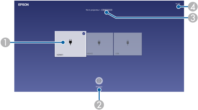 La fonction Écran d'accueil vous permet de sélectionner facilement une source d'image et d'accéder à des fonctions utiles. Vous pouvez afficher l'Écran d'accueil en appuyant sur le bouton Home du panneau de commande. L'Écran d'accueil est également affiché quand vous allumez le projecteur et si aucun signal n'est en entrée.