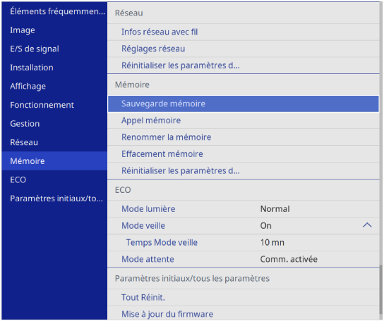 Les paramètres du menu Mémoire vous permettent de gérer la sauvegarde et le chargement des paramètres de la qualité d'image dans la mémoire du projecteur.