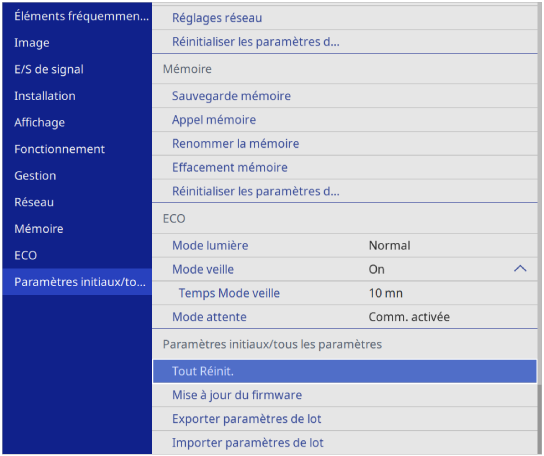 Les paramètres du menu Paramètres initiaux/tous les paramètres vous permettent de réinitialiser certains paramètres du projecteur à leurs valeurs par défaut et de placer le projecteur en mode de mise à jour du firmware pour pouvoir mettre à jour le firmware.