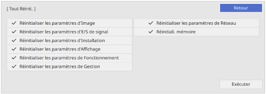 Vous permet de sélectionner des menus pour réinitialiser les paramètres aux valeurs par défaut. |