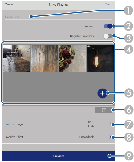 Ouvre l'écran Changer d'image. Vous pouvez spécifier l'intervalle temps pour passer au fichier image suivant. Vous pouvez également sélectionner un effet de transition. |