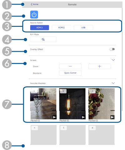 Les options sur l'écran Remote vous permettent de sélectionner la source d'entrée, de contrôler le projecteur et de lancer la projection de listes de lecture.
