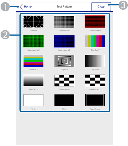 Affiche les mires disponibles, sélectionnez pour projeter une mire. (Les mires disponibles varient selon le modèle du projecteur.) |