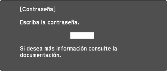 Si sigue repitiendo la operación anterior e introduce una contraseña incorrecta 30 veces seguidas, aparecerá el mensaje El proyector estará bloqueado. Diríjase a Epson siguiendo las indicaciones de su documentación. y el proyector no aceptará más entradas de contraseña. Póngase en contacto con Epson para obtener ayuda.