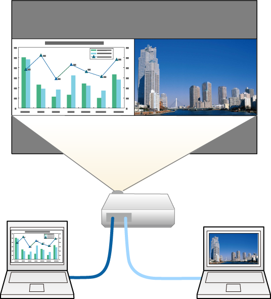 Puede utilizar la función de pantalla dividida para proyectar simultáneamente dos imágenes de fuentes de imágenes diferentes. Puede controlar la función de pantalla dividida con en el control remoto o menús del proyector.
