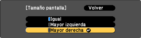 Para ampliar una imagen y reducir la otra imagen, seleccione Tamaño pantalla, pulse Enter, seleccione un tamaño, pulse Enter. Para salir del menú, pulse Menu.