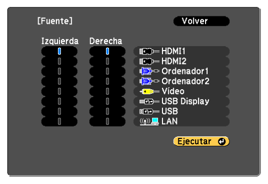 Para seleccionar una fuente de entrada para la otra imagen, seleccione la configuración Fuente, pulse Enter, seleccione la fuente de entrada, seleccione Ejecutar y pulse Enter.