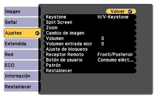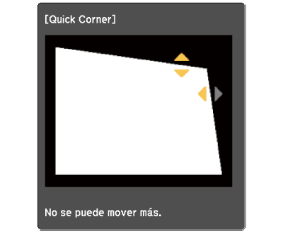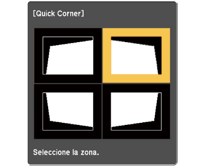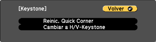 Para restablecer las correcciones de Quick Corner, mantenga pulsado Esc durante aproximadamente 2 segundos mientras aparezca la pantalla de ajuste Quick Corner y seleccione Reinic. Quick Corner. Seleccione Cambiar a H/V-Keystone para cambiar el método de corrección de la forma de imagen a H/V-Keystone.