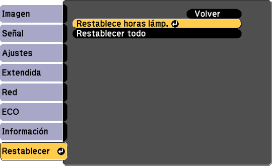 Seleccione Restablece horas lámp. y pulse Enter.