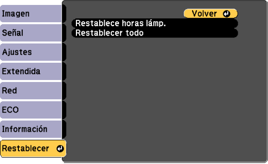 Puede restablecer la mayor parte de los ajustes del proyector a los valores predeterminados con el menú Restablecer.
