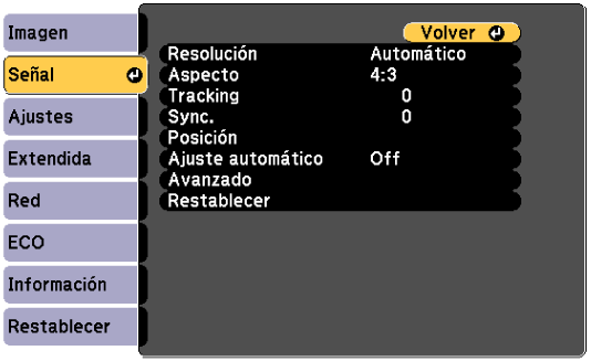 Generalmente, el proyector detecta y optimiza automáticamente la configuración de señal de entrada. Si es necesario personalizar la configuración, puede utilizar el menú Señal. La configuración disponible dependerá de la fuente de entrada actualmente seleccionada.