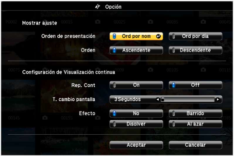 Muestra archivos durante el tiempo seleccionado y cambia al archivo siguiente de forma automática; las imágenes en alta resolución podrían cambiarse a una velocidad ligeramente más lenta |
