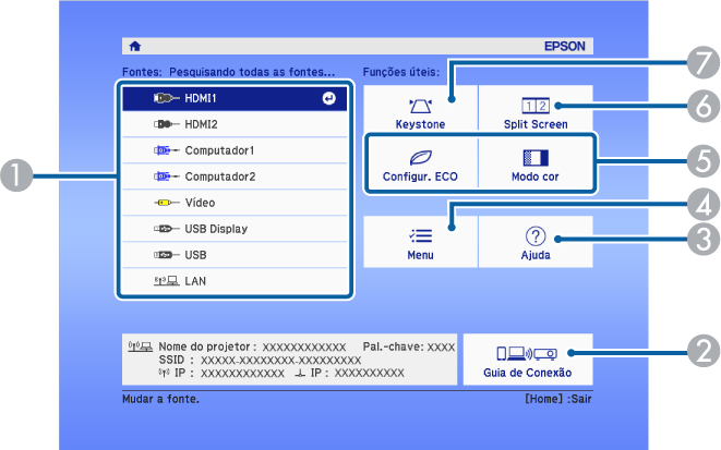 A função Tela Inicial permite selecionar facilmente uma fonte de imagem e aceder a funções úteis. É possível exibir a Tela Inicial premindo o botão Home no painel de controlo ou no controlo remoto. A Tela Inicial também é exibida quando o projetor for ligado e não estiver a ser recebido qualquer sinal.