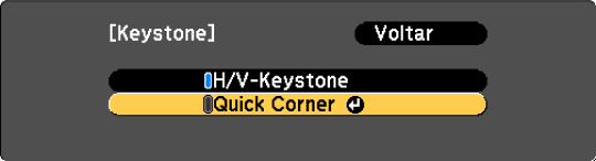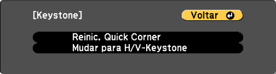 Para repor as correcções da função Quick Corner, mantenha premido o botão Esc durante cerca de 2 segundos durante a exibição do ecrã Quick Corner e selecione Reinic. Quick Corner. Selecione Mudar para H/V-Keystone para mudar o método de correcção da forma da imagem para H/V-Keystone.