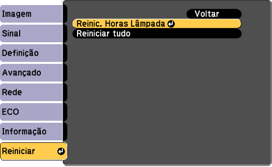 Selecione Reinic. Horas Lâmpada e prima Enter.