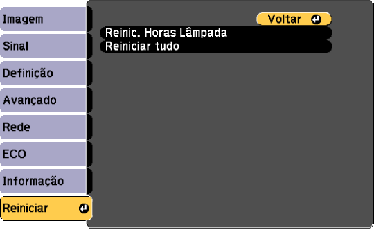 Pode repor as predefinições da maioria das definições do projetor utilizando o menu Reiniciar.