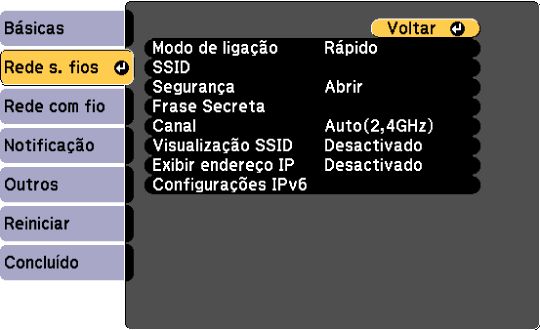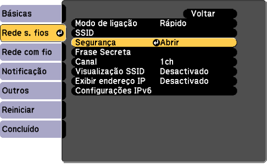 Pode configurar a segurança para utilizar o projetor numa rede sem fios. Configure uma das seguintes opções de segurança para coincidir com as definições utilizadas na sua rede:
