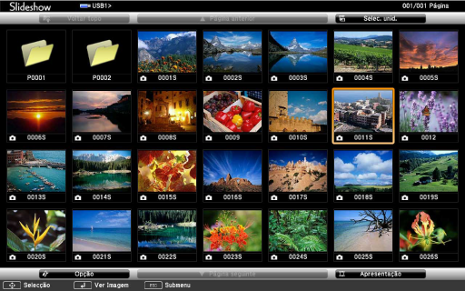 Para exibir uma apresentação de dispositivos de todas as imagens de uma pasta, utilize os botões direcionais para realçar a opção Apresentação na parte inferior do ecrã e prima Enter.