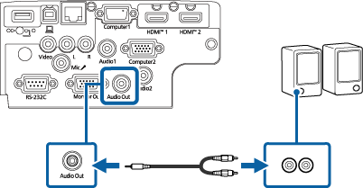 Para melhorar o som da sua apresentação, pode ligar o projetor a altifalantes externos amplificados. Pode controlar o volume utilizando o controlo remoto do projetor.
