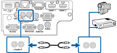 Ligue a outra extremidade às portas L-Audio-R do projetor.