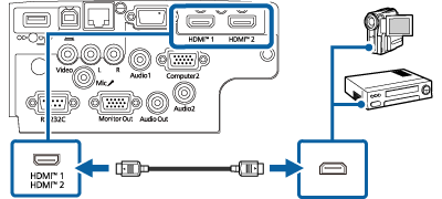 Se o equipamento de vídeo estiver equipado com uma porta HDMI, pode ligá-lo ao projetor utilizando um cabo HDMI para reproduzir o áudio do equipamento de vídeo com a imagem projectada.