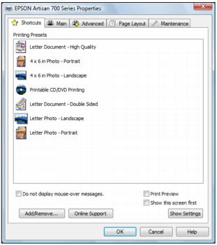 • Select a printing preset to quickly select settings for common paper types, sizes, and print qualities.For quick access to the most common settings, click the Shortcuts tab. Point to one of the Printing Presets to view a list of the settings for it.To delete a preset you created, click Add/Remove on the Shortcuts tab, select the preset, and click Delete.Click the Main tab on the top of the printer settings window to select your basic print options.