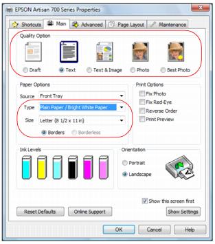 Click the Main tab on the top of the printer settings window to select your basic print options.