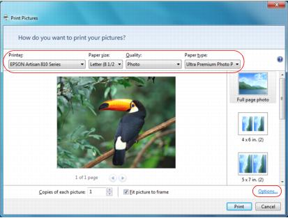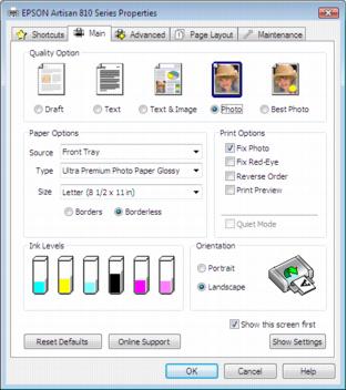 4. Select the Artisan 810 Series as the Printer setting, then choose the size and type of paper that you loaded.