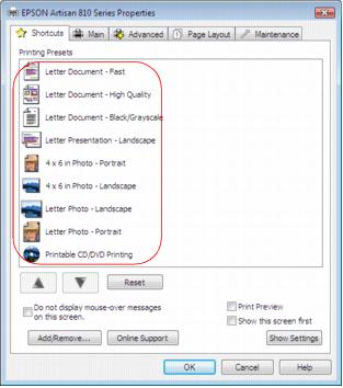 • Select a printing preset to quickly select settings for common paper types, sizes, and print qualities.For quick access to the most common settings, click the Shortcuts tab. Point to one of the Printing Presets to view a list of the settings for it.To delete a preset you created, click Add/Remove on the Shortcuts tab, select the preset, and click Delete.To reorder the list, highlight one of the Printing Presets and click the up or down arrow to move it. Or click Reset to return the list to its original order.Click the Main tab on the top of the printer settings window to select your basic print options.