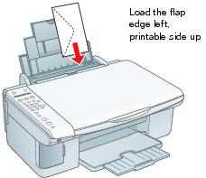 Envelopes 1. Open the paper support and output tray, then slide out the extensions. 2. Flip the feeder guard forward. 3. Slide the left edge guide to the left. 4. Load up to 10 envelopes at a time, flap edge left, printable side up, against the right edge guide. Note: For best results, press each envelope flat before loading, or load one envelope at a time. 5. Slide the left edge guide against the envelopes (but not too tightly). 6. Flip the feeder guard back. 7. Set the paper thickness lever to the H position. Select the following settings when printing on envelopes: • Envelope as the paper Type or Media Type setting • The correct envelope size as the Size or Paper Size setting • Landscape as the Orientation setting For instructions on selecting these settings, see: • Printing in Windows • Printing with Macintosh OS X