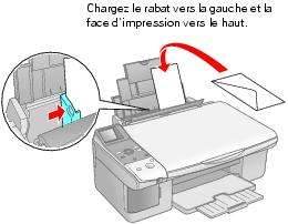 - Chargez jusqu'à 10 enveloppes à la fois, rabat vers la gauche et face d'impression vers le haut, contre le guide-papier droit.