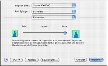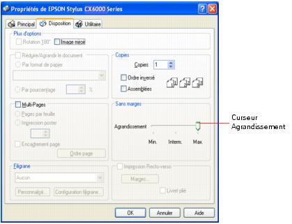 - Au besoin, réglez le curseur Agrandissement de la zone Sans marges sur Min. ou Max., ou sélectionnez un réglage entre les deux.