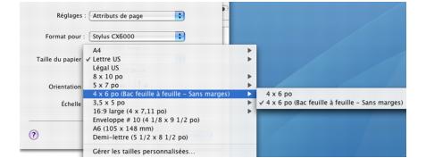 - Sélectionnez la taille du papier. Pour l'impression sans bordure, sélectionnez un format de papier avec l'option Bac feuille à feuille - Sans marges. Voyez Impression de photos sans marges pour les détails.
