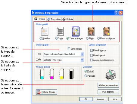 Votre appareil CX6000 Series se règle automatiquement en fonction du type de papier que vous avez sélectionné dans les paramètres d'impression. C'est ce qui donne toute son importance au paramètre Type (Windows) ou Support (Macintosh). Il indique à votre imprimante le type de papier utilisé et règle la densité d'encre en conséquence.