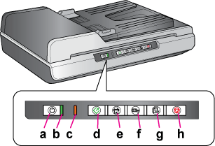 Power buttonb. Ready light c. Error light d. Start buttone. Copy buttonf. E-mail buttong. PDF buttonh. Cancel buttonLightsThe Ready light is next to the