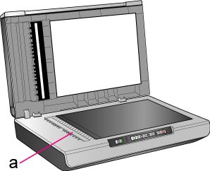 Carefully inspect the small glass window on the left side of the document table (Area a). Any debris or scratches on the small glass may result in a line running the length of the scanned document.
