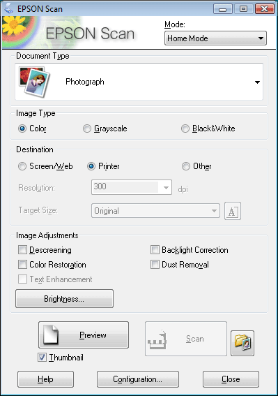 Scanning in Home ModeWhen you select Home Mode, you see the Epson Scan Home Mode window.